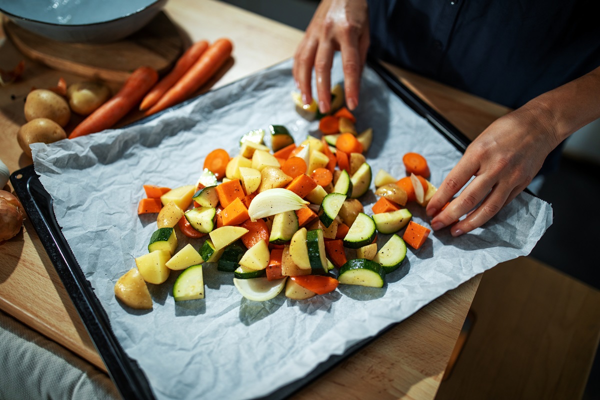 Preheat oven to 375 degrees Fahrenheit. Then prepare vegetables by washing and cutting into 1-inch, similarly sized pieces.
