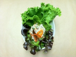 Scoop mixture onto a bed of Bibb lettuce, and enjoy with a thin sliced grilled baguette.