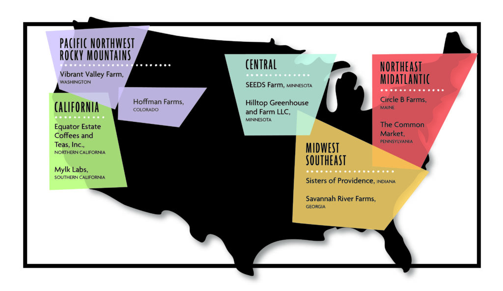 These businesses come in all shapes and sizes. Common Market, a local-food aggregator started by Tatiana Garcia-Granados and her husband Haile Johnston in Pennsylvania, now operates in Georgia, Texas, and throughout the Northeast, connecting food purveyors and institutions like Bon Appétit at the University of Pennsylvania and Emory University to a small army of local farmers. Equator Estate Coffees and Teas Inc. was founded by Brooke McDonnell and Helen Russell in a Bay Area garage in 1995, and now distributes their mission-driven coffee nationwide. Thankfully, despite their tech-like start and ensuing decades of success, they still have time to supply the Bon Appétit teams at Mills, and Twitter. In the Midwest, SEEDS Farm, started by St. Olaf College alumni Rebecca Carlson has cultivated a relationship with the Bon Appétit teams at Carleton and St. Olaf for years, providing hyper-local produce to both schools’ kitchens. The Bon Appétit team at Carleton even catered Rebecca’s wedding last year.