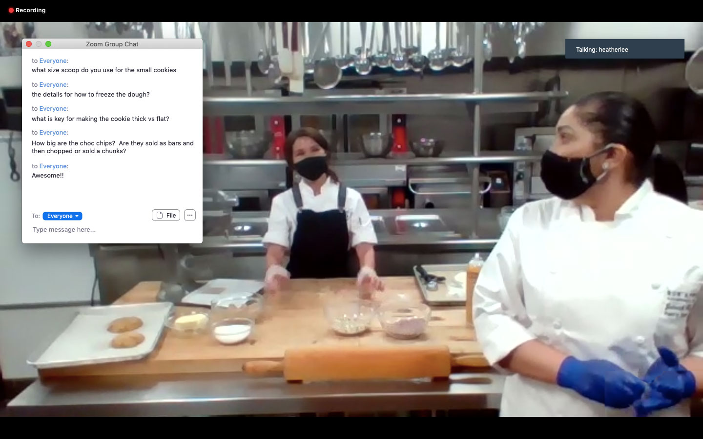300 Bakery Executive Chef Terri Wu (back) and Sous Chef Janeth Estrada (front) donned masks in the Oracle Kitchen to take almost 100 Oracle viewers through a step-by-step chocolate cookie-making demonstration