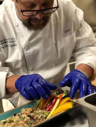 - Café 300 Chef de Cuisine Jose Luis Ugalde shared the recipes in a live demo of his very popular baba ganoush and flatbread — usually sold out at the Mezze Station during “normal” lunch service