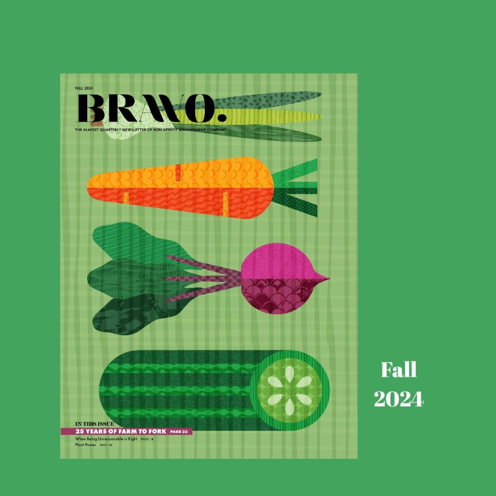 We’re thrilled to share the newest issue of Bravo – affectionately known as the “almost-quarterly newsletter of Bon Appetit Management Company,” which went on hiatus during the pandemic. Today, it’s back with a new format but the same commitment to celebrating our people and their accomplishments. In this issue, we’re celebrating 25 years of our groundbreaking Farm to Fork program, the power of our plant-forward revolution, openings, events, and so much more!