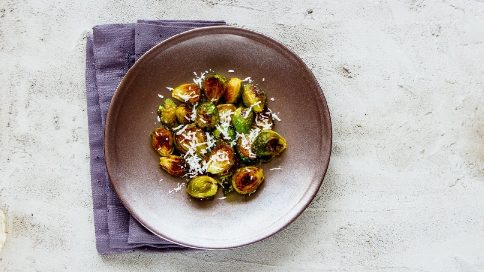 Wash and clean Brussels sprouts, cut in half lengthwise. Toss with remaining oil and season and with salt and pepper. Spread evenly over a parchment lined sheet pan. Roast until the Brussels sprouts are tender and the outside leaves are crispy and charred, about 30 minutes.