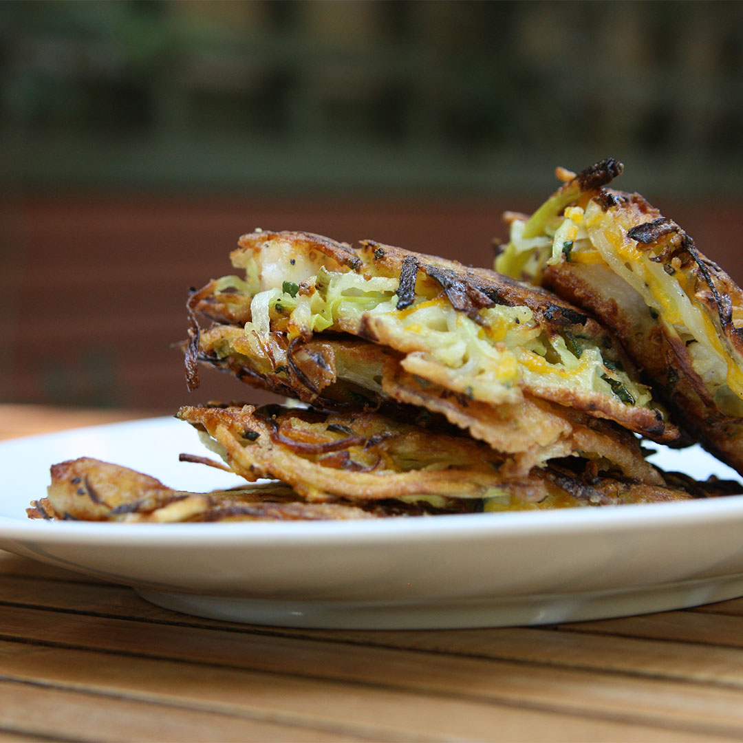 Okoy is a Filipino street food of crispy pan-fried fritters. Okoy is traditionally made with flour and egg batter with shrimp, shredded hard squash or sweet potatoes, bean sprouts, onions, and carrots. This okoy recipe version replaces the onions with leeks. Makes 6 servings