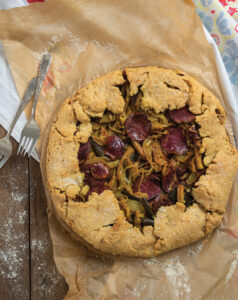 Vegetables were the stars on our tables, and they still are. Meat wasn’t always readily available, but because farming families in the Brookman Community shared their harvests and we traded among ourselves, everyone had plenty to eat. We never knew hunger because of that collective spirit. I’ve always been drawn to rustic presentations, things made simply with caring hands, and a modest, unassuming galette represents that warmth and kindness to me. Serve alongside the Watermelon Steak Salad with Heirloom Tomatoes and Sangria Vinaigrette for a balance of savory and sweet sensations.