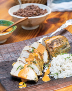When I ran the Satin and Savory Catering Company in Atlanta, one of my go- to dishes for a large event was sliced pork loin, rather than roasted turkey or prime rib. I also wanted to introduce guests to new and unexpected flavors, like the sunny- spicy- smoky- sweet sensation of Calypso Seasoning, which has a hint of citrus and some heat from dried chilies. When you eat this dish, you’ll hear Harry Belafonte singing “Day- O.” Serve with a side of Saffron and Coconut Milk Rice (page 30).
