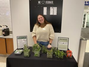 My trips to both Macalester College in St. Paul, MN and Butler University in Indianapolis, IN, were centered around herb-themed events. One highlight at Butler was an Herb ID tabling event held outside Atherton Union, where I engaged with around 50 students, including a few elementary school visitors. I encouraged participants to identify any herbs they recognized, and then we discussed those they weren’t familiar with. We smelled, touched, and tasted the herbs and talked about their common culinary uses. This event also highlighted the reusable BlueGo bowls, Butler’s status as a FairTrade University, and Bon Appétit’s Farm to Fork local purchasing program. I believe everyone who stopped by the table walked away with new knowledge (myself included)!