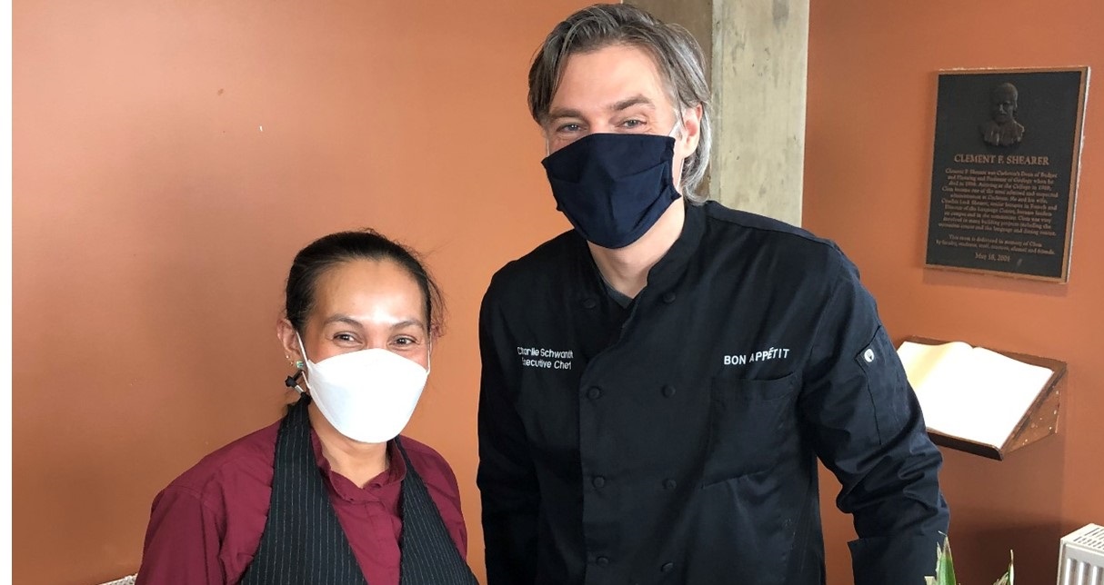 showcasing Filipino food with a beloved special guest: Cashier Phoebe Wilmot. Phoebe grew up in the Philippines, and has worked at Carleton for over 25 years in a variety of roles. Executive Chef Charlie Schwandt often relies on her culinary insights: “Whenever we do Filipino food in the dining halls, Phoebe is always my first go-to in terms of making sure we are doing authentic food, and doing things right,” he says.
