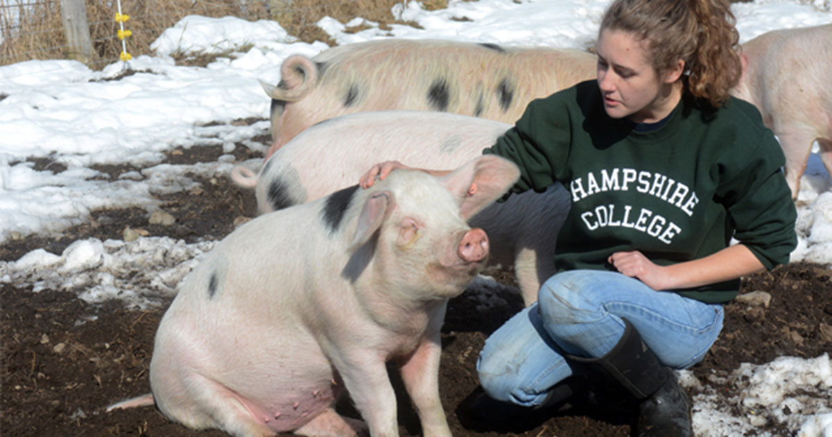 Student April Nugent works with pigs at the Hampshire College Farm. Photo: Hampshire College