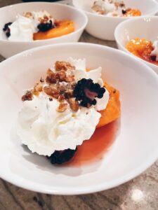 This August, my husband and I decided to host a small gathering for friends and cooked up a menu of seasonal favorites. The best was a dessert made of peaches poached in prosecco and honey. Lightly sugared on top, torched to produce a caramelized top, then served with whipped cream, crushed candied walnuts, blueberries, and reduced poaching liquid. It was a simple dessert but it was also grand in its own way. The entire evening was magic. The joy of seeing old friends, meeting new ones, and breaking bread together was inexpressibly wonderful after so much time apart. It took sharing peaches with friends at our dinner party to remind me how much I appreciated my first road trip, my first peach, and the hundreds thereafter.