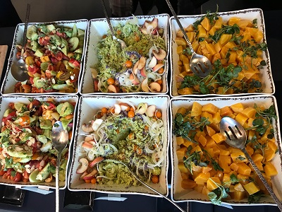 Given the focus of the event, a wholly plantbased menu was a given, and Senior Events and Catering Manager Andrea Valenzuela and Events and Catering Coordinator Emily Claus made sure that it was accompanied by reusable china and utensils. Executive Pastry Chef Vincent Attali and Lead Pastry Cook Simon Brown made blueberry, honey, and molasses muffins and sweet potato, raisin, and olive oil bread for the breakfast snack. Café Chef Ryan Wilson, Senior Sous Chef Max Ford, and Sous Chef Barry Shinto came up with a colorful, delicious, and very satisfying buffet that no one realized was vegan especially those who had missed the menu description of the jackfruit and white bean cassoulet and were staring in confusion at what looked like pulled pork, but they knew to be plant-based!