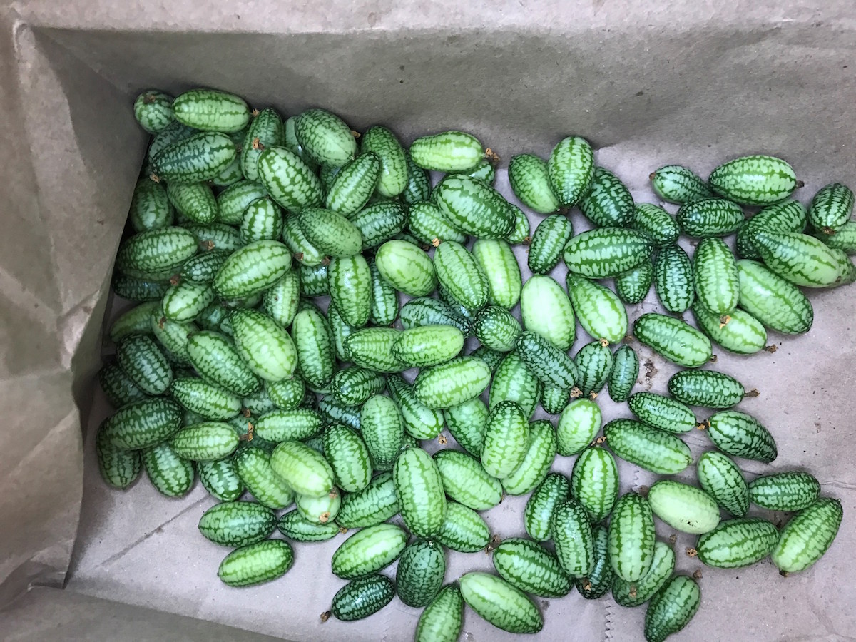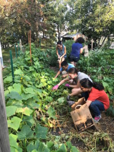 Macalester students harvesting sour gherkins from the MULCH garden plot for use at Café Mac