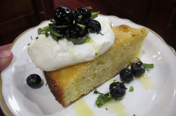 Toss berries with fresh herbs (optional). Allow cake to cool, garnish with berries, sweetened yogurt and olive oil drizzle (optional).
