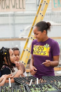 FoodCorps Service Member Stephanie Simmons with students at the Food Project in Roxbury, Massachusetts. Photo credit: Kelly Campbell