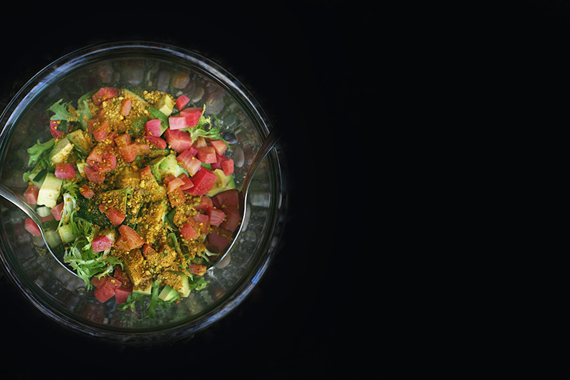 Sprinkle the salad generously with pistachio dust. Serve.