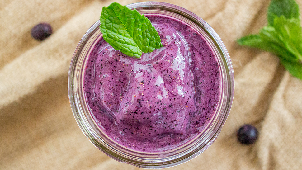 This hydrating smoothie can help cool you down from the inside out. A blend of antioxidant-rich blueberries and cooling mint leaves help combat inflammation and will give you a refreshing break to your summer activities.