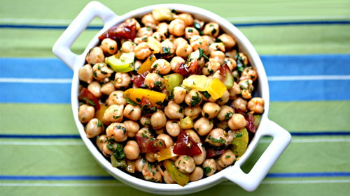 Stir in the chickpeas, cilantro, mint, sugar, and tomatoes. Give a final stir, and serve immediately, or allow the flavors to meld for a few hours in the refrigerator.