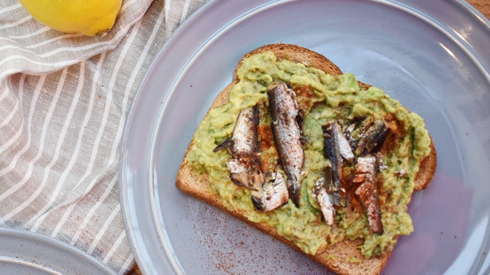Toast 2 slices of bread to desired crispiness. Assemble toast by topping each slice evenly with avocado mash and sardines.