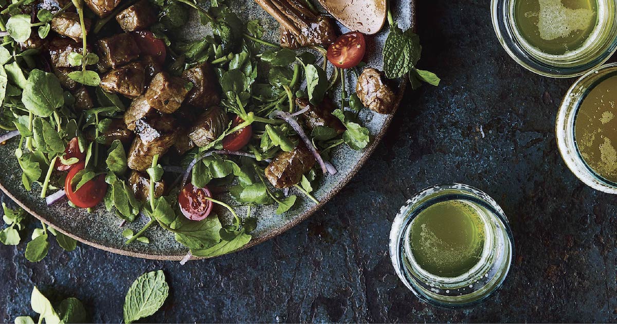 A deliciously quirky combo of warm cubes of seared steak atop a cool salad, this classic is traditionally considered a special-occasion dish in Vietnam, where beefsteak is a luxury. Given that, cooks cleverly cut the meat into smaller pieces to imbue it with flavor, cook it quickly, and serve it to a crowd. The name in Vietnamese, thịt bò lúc lắc, refers to the back-and- forth shaking (lúc lắc) of the skillet as the beef (thịt bò) cooks. Shaking beef is a Viet restaurant favorite, and a cinch to make at home.