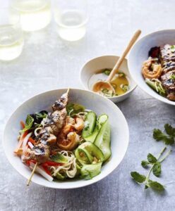To quickly make your own, keep some dried noodles on hand as well as a jar of nước chấm sauce base, washed herbs and lettuce or baby lettuce mix, and roasted nuts. All that’s left is the main attraction. Following is a versatile marinade for beef, pork, and chicken skewers. In the Notes you’ll find more ideas to fuel your creativity.