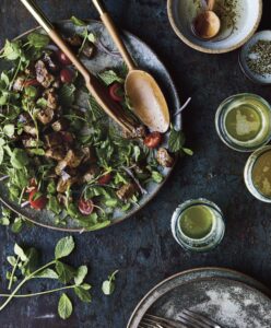 Quickly toss the salad and transfer everything, including the dressing, to a platter or serving dish. Pile the cooked beef and its juices on top and serve immediately. At the table, ceremoniously combine all the ingredients and invite diners to dive in.