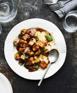 This earthy, tangy main dish shares the same sauce as the Pomegranate Sriracha Shrimp in my book, Vietnamese Food Any Day, but the tofu, soy sauce, and vegetables turn it into something distinctively delicious. Tofu is typically deep-fried for dishes like this one, but panfrying is a healthier way to inject richness and character. For texture, complexity, and color, I add mushroom and mild-tasting chiles. Anaheims are my go-to but during the warmer months when chiles are in season, I love to use varieties such as Hatch and Corno di Toro. In a major pinch, half a large bell pepper will do. Enjoy with rice.
