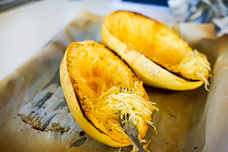 *Cutting a spaghetti squash in half can be difficult. To make the task easier, create several small slits in the skin with a knife and microwave squash 5-6 minutes then cool for 10 minutes before slicing in half.
