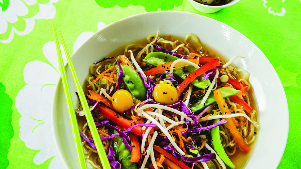 Pour 2 cups (475 mL) soup over each bowl of noodles. Top with vegetable mixture, menma, and quail eggs. Garnish with sesame seeds and chives.