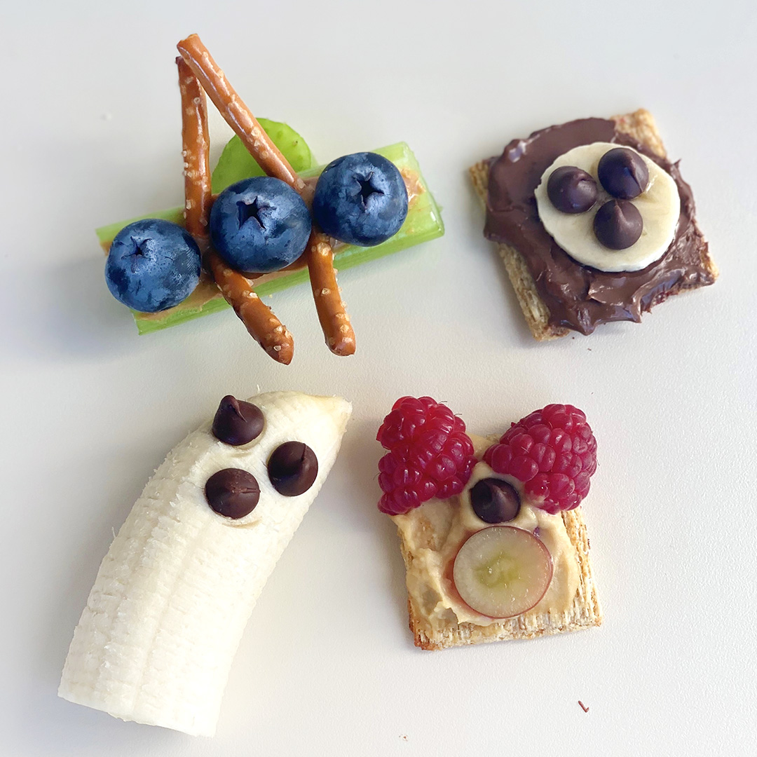 Cut up fruits, and vegetables, and use sticky butters and spreads to assemble creative creatures!