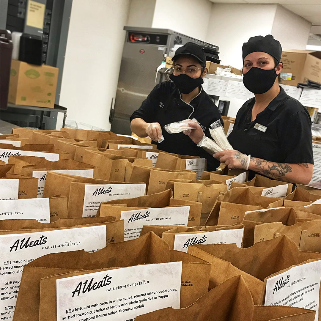AUeats Sous Chef Berta Arroyo and Gazebo Retail Store Manager Angela Martinache preparing AUeats orders for delivery