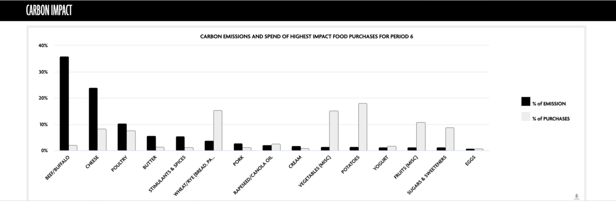 It was while brainstorming new indicators for the Dashboard that things came full circle. Using findings from the study as inspiration, Shannon suggested adding a Carbon Impact indicator, which measures both the carbon emissions and spend of the highest climate impact foods, allowing Bon Appétit teams to identify when their spend causes the carbon-intensity of their menus to spike, and make adjustments accordingly.