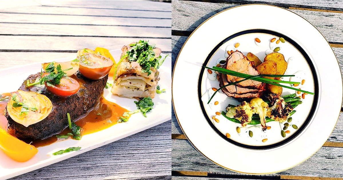 Nates Coffee–braised short ribs with potato pavé, beef Bordelaise caramelized pearls, and heirloom tomatoes, and Tandoori-rubbed pork-loin curry with roasted Yukon gold potatoes, haricot verts, charred cauliflower, tzatziki, and toasted pepitas and pine nuts