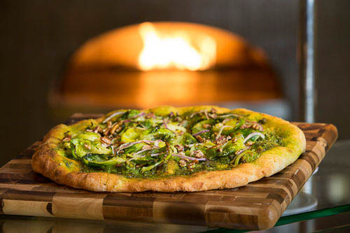Middle photo: Cheeseless whole wheat pizza with Brussels sprouts, red onion, roasted garlic, and parsley pecan pesto by Bart Nagel Photography