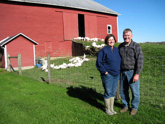 Melissa and Aaron Miller of Miller Livestock in Kinsman, Ohio, who recently received Food Alliance certification for their pastured pork and lamb. Bon Appétit buys half of all the hogs the Millers raise and “really pushed us to take it to the next level,” says Melissa Miller. “We would not have pursued it without their support. They even offered to reimburse us for the fees. We are thrilled to be the first Food Alliance-certified ranch in Ohio!” Photo by Piper Fernwey, Bon Appétit.