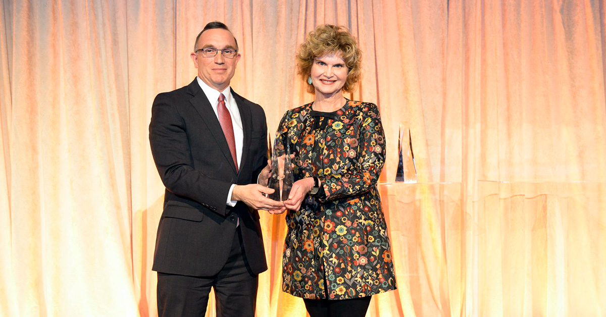 Bon Appétit Regional Vice President Elaine Smart accepting the Rabobank Leadership Award from David Bassett, Rabobank North America Head of Wholesale Banking