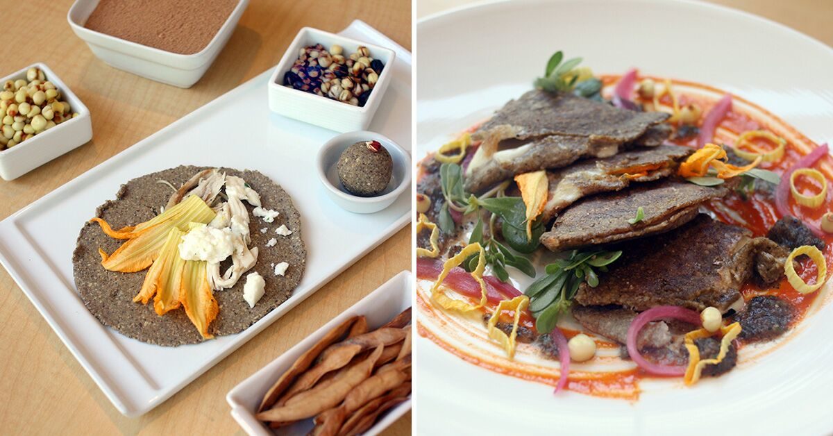MESQUITE MAGIC AT MIM: Executive Chef/Regional Forager Chris Lenza and Baker Yesenia Perrino at Café Allegro at the Musical Instrument Museum in Phoenix make their own nixtamal for the tortillas in these all-local quesadillas, mixing dried local heirloom corn with mesquite flour (which is milled from the husks of dried mesquite pods and has a low glycemic index and a nutty flavor) for the maseca (corn flour masa). Yesenia taught the technique to Chris, a process she learned from her grandmother that is common in the Sonora region of Mexico.